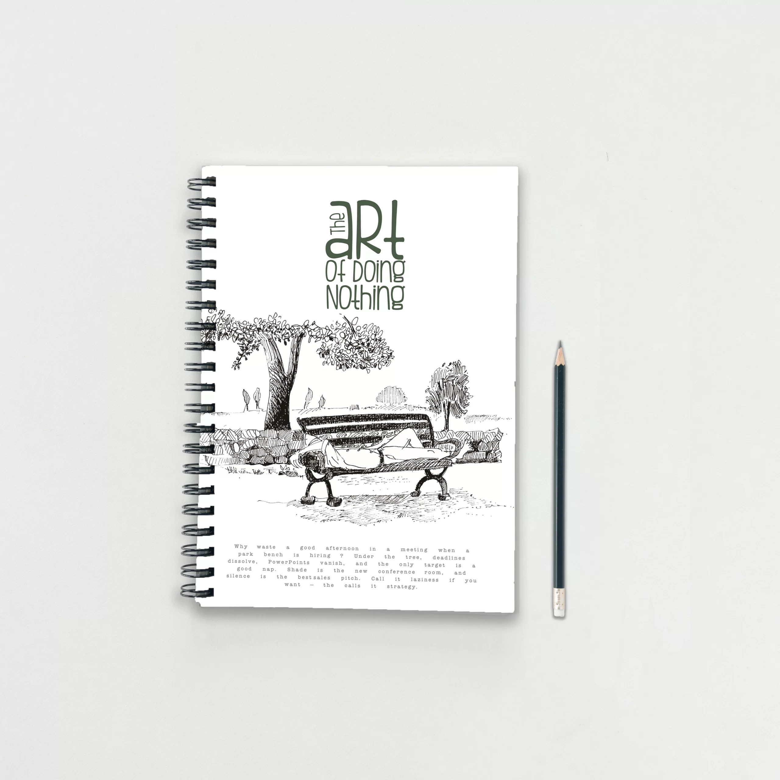 Permission to pause, granted. This notebook celebrates strategic idleness—the sweet spot where ideas sneak in while you’re “busy” doing nothing. The cover features a pen-and-ink park scene: a lone bench, a lazy afternoon, and a professional daydreamer putting in the real work—thinking.