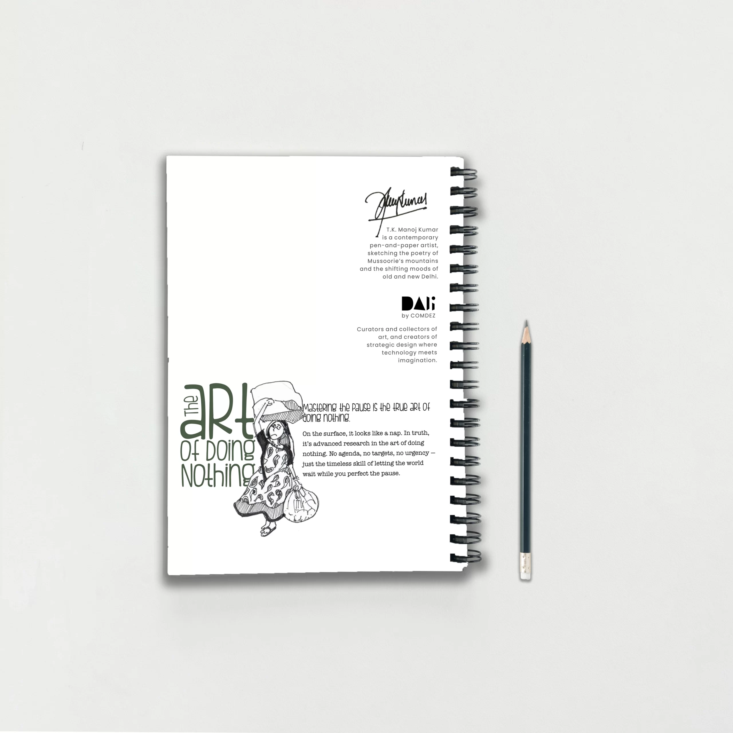 • Original line-art by T.K. Manoj Kumar with the headline: “The Art of Doing Nothing.”