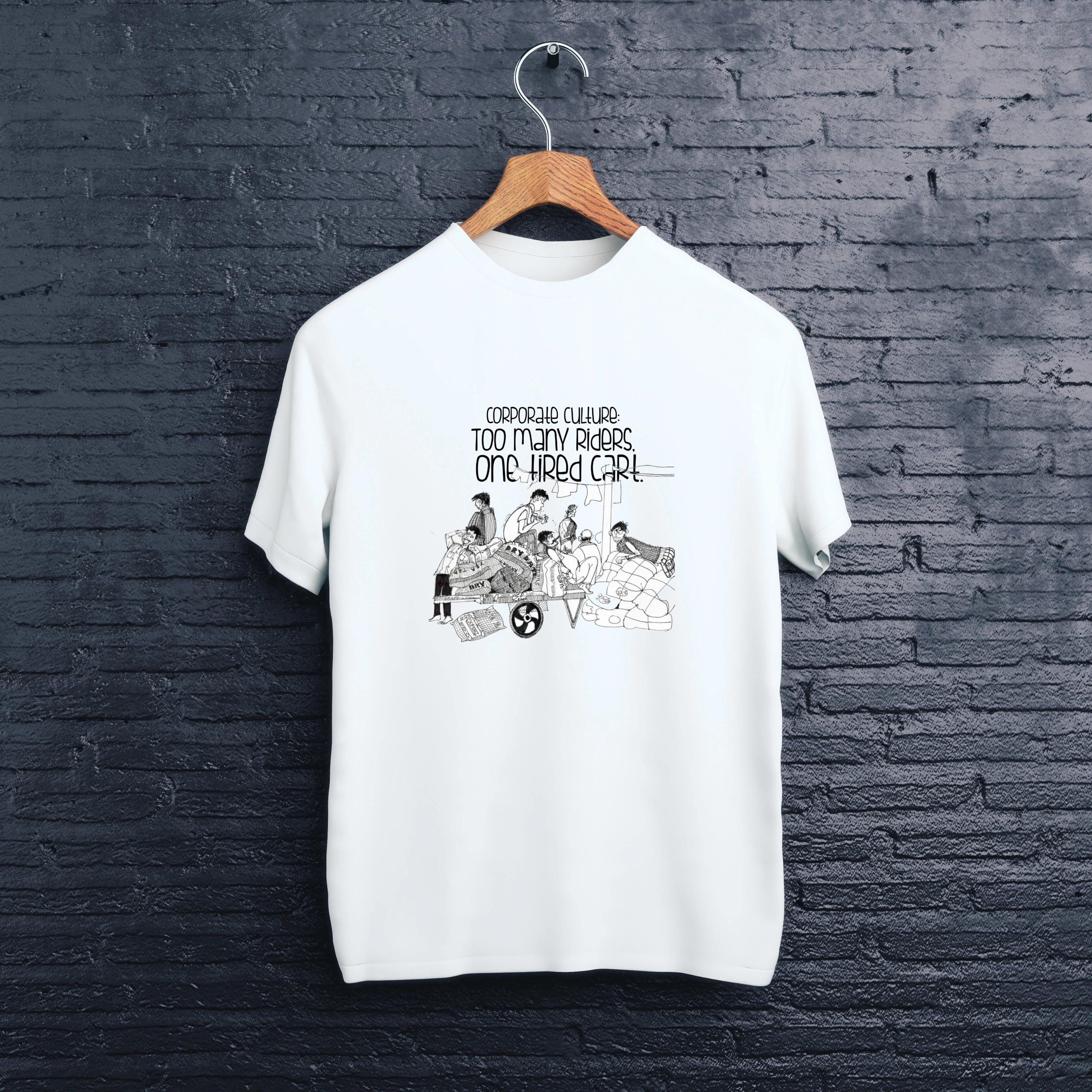 Smart line-art graphic with the caption: “Corporate culture: Too many riders, one hired cart.”