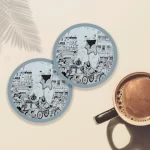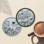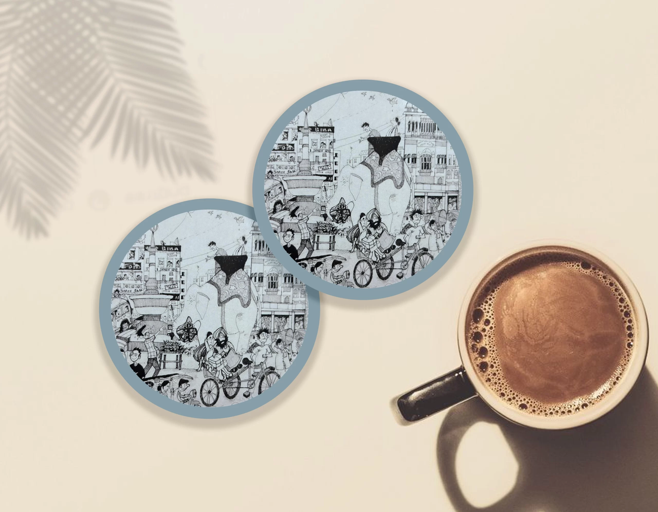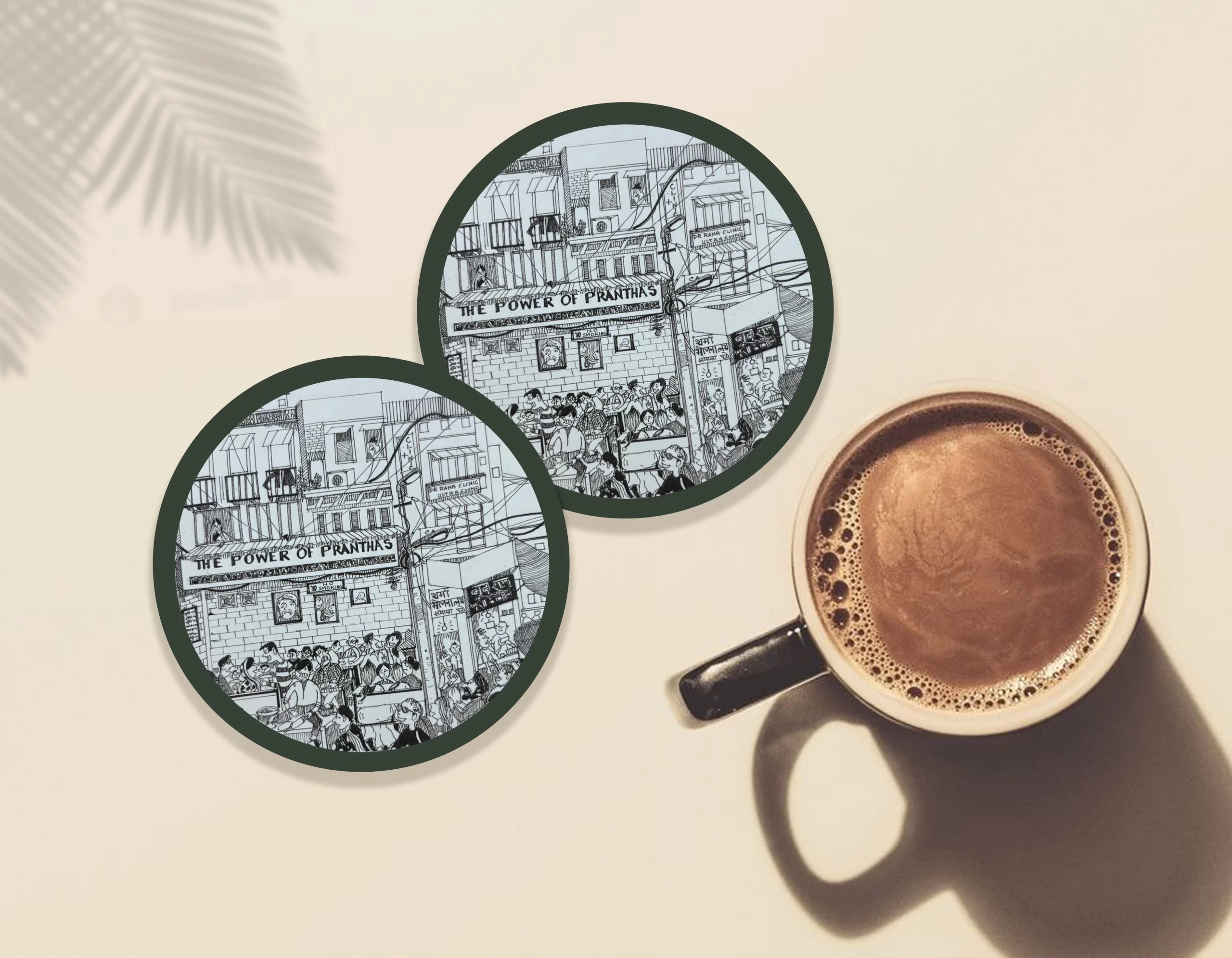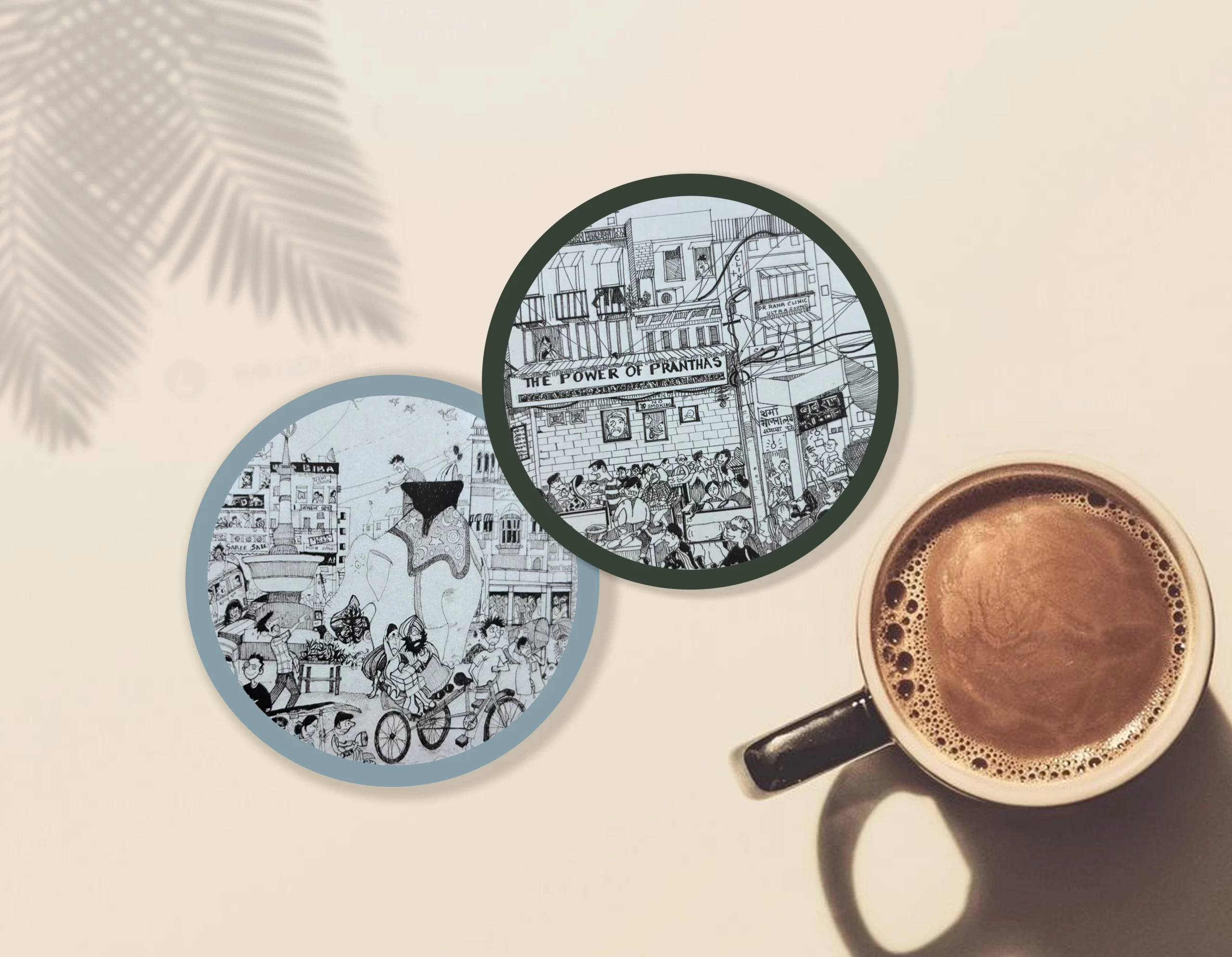 Bring the theatre of Old Delhi to your table. These illustrated round coasters feature hand-drawn scenes from Chandni Chowk—rickshaws weaving, shopfronts buzzing, and the legendary Paranthe Wali Gali in full swing. They don’t just catch drips; they catch stories.