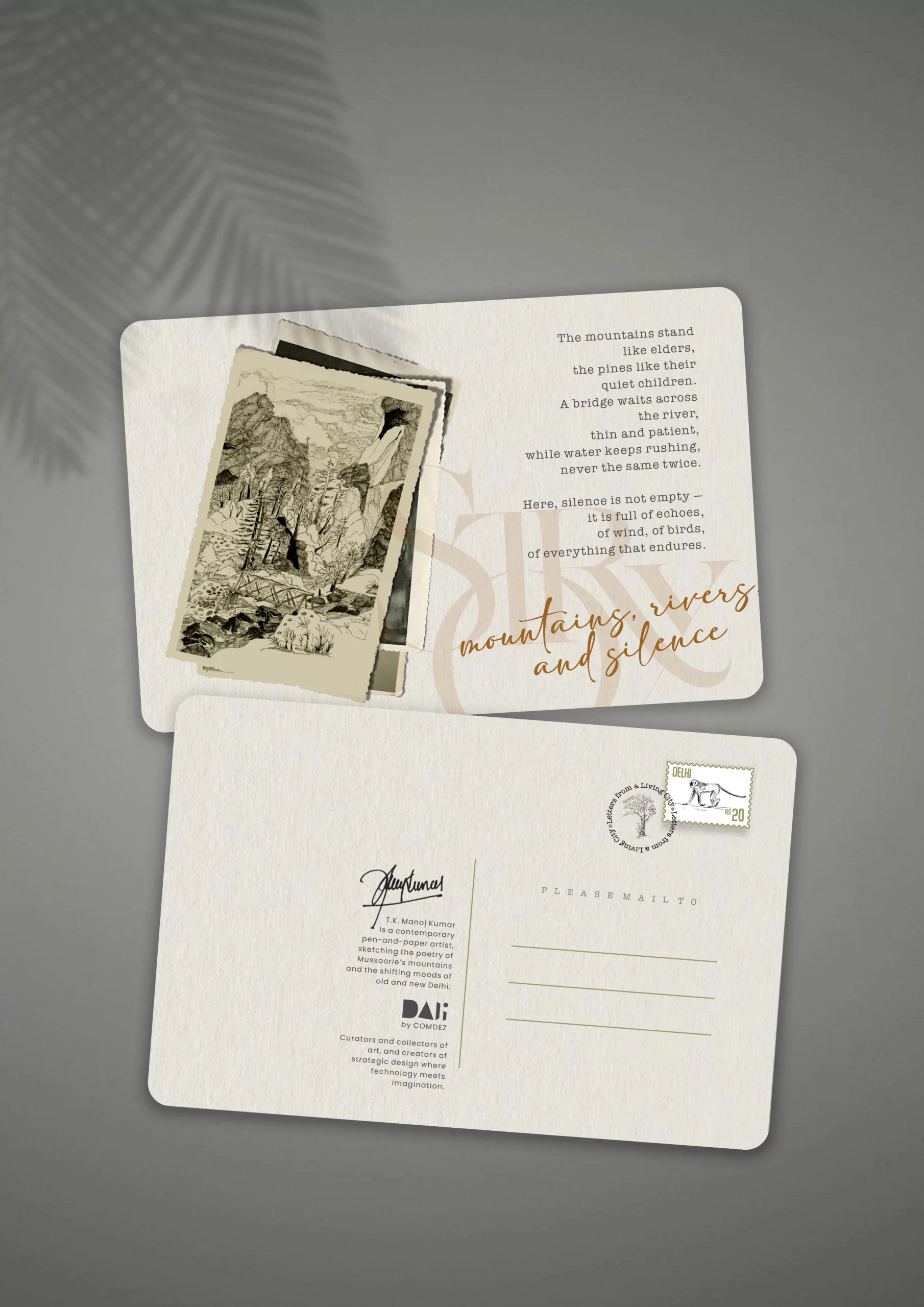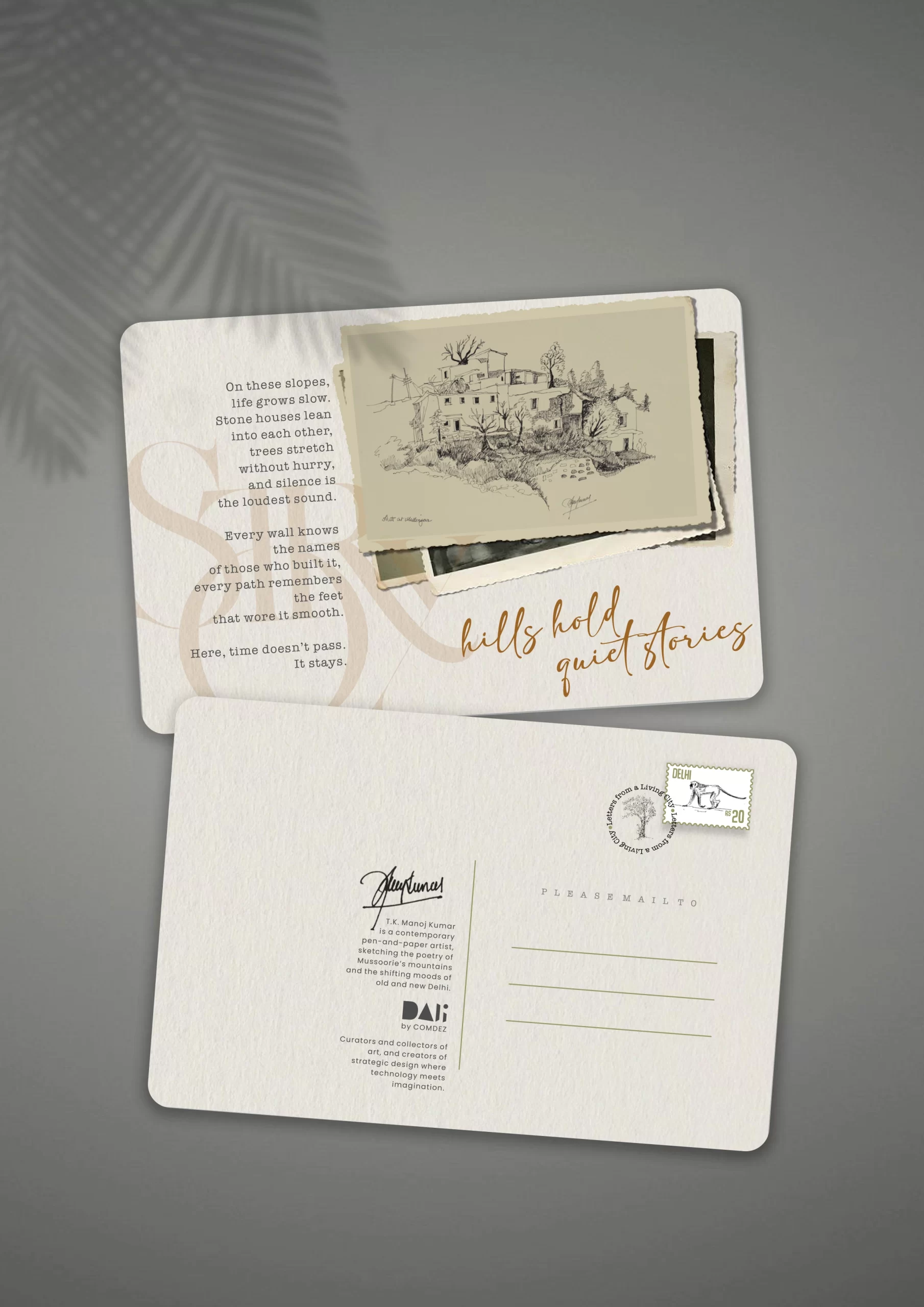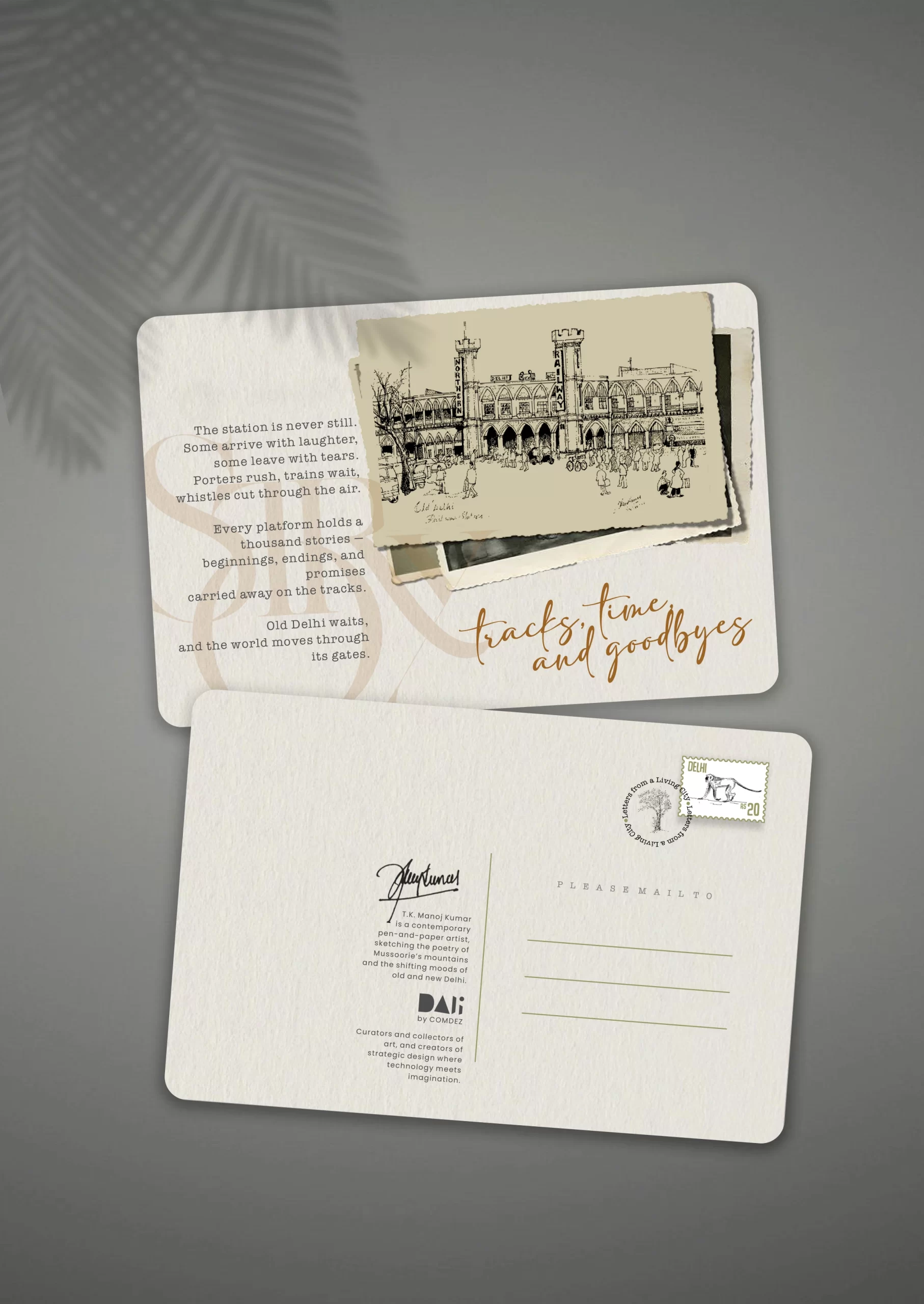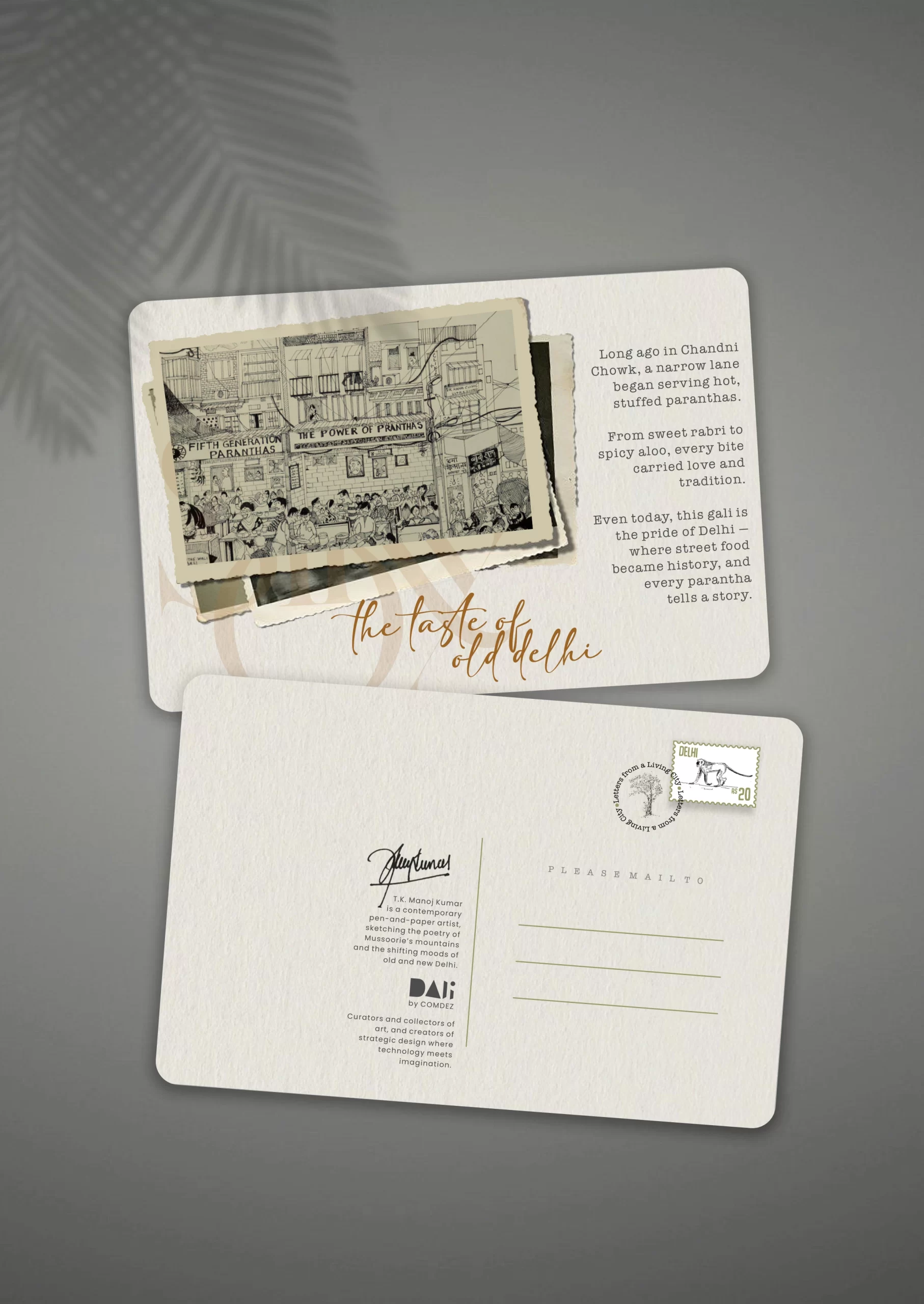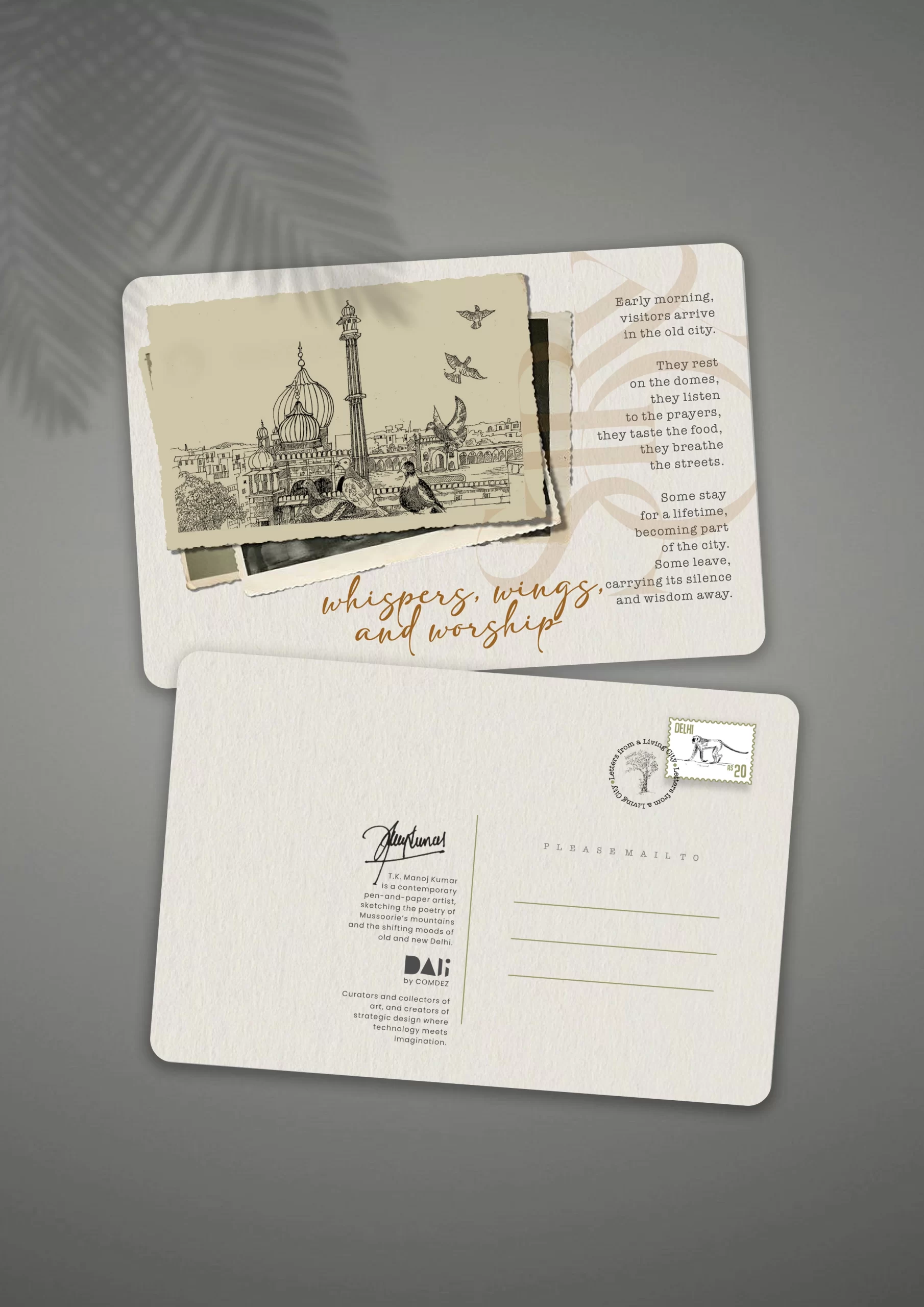 Capture the soul of Old Delhi with this exquisitely illustrated  Old Delhi illustrated postcard. Featuring a detailed pen-and-ink sketch of the iconic Jama Masjid and its timeless skyline, this piece carries with it the echoes of prayers, the flutter of pigeons, and the quiet hum of history.